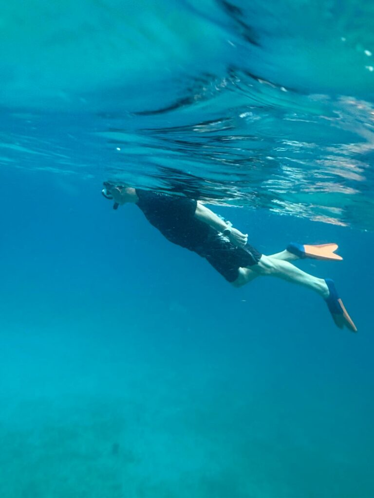 The author contemplating longevity while checking on the sea turtles during a morning swim in Grande Anse d’Arlet, Martinique, France. Those legs, though. Photo credit: Trevor Pacholok